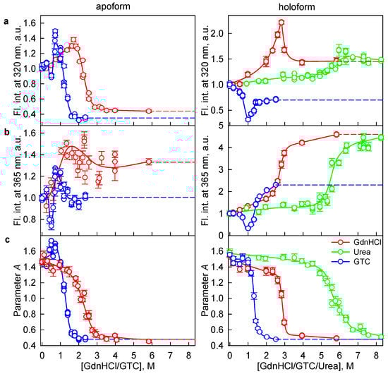 Unfolding of iRFP713 in the apoform (left panels) and holoform (right panels) induced by different chemical denaturants. (a,b) Changes in the tryptophan fluorescence intensity at an excitation wavelength of 295 nm and registration wavelengths of 320 and 365 nm. The values of fluorescence intensity I320 and I365 were normalized to unity at zero concentration of denaturants. (c) Changes in the parameter A = I320/I365 at an excitation wavelength of 295 nm. The values of the recorded characteristics for iRFP713 unfolding induced by GdnHCl, GTC and urea are represented by red, blue, and green circles, respectively. The measurements were performed after 24 h incubation of the native protein in the presence of denaturants. Error bars are s.e.m., n = 3.