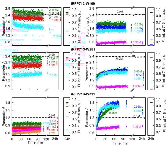 Kinetic traces of unfolding of mutant variants iRFP713-W109, iRFP713-W281, and iRFP713-W311 in the holoform induced by GdnHCl (left panel) and GTC (right panel). Changes in the parameter A = I320/I365 at an excitation wavelength of 295 nm. The values of the chromophore fluorescence intensity at an excitation wavelength of 690 nm after 24 h after mixing the solutions of the mutant protein and denaturant are designated as lines on the right on the panels. Numerals at the curves specify applied denaturant concentration.