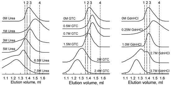 Changes in hydrodynamic dimensions at holoform iRFP713 unfolding induced by urea (left panels), by GTC (central panels), and by GdnHCl (right panels). Changes in elution profile of iRFP713 in the holoform at increasing denaturant concentration. Numerals at the curves specify applied denaturant concentration. Dotted lines designate the positions of the elution peaks of proteins with a known molecular mass used for calibration of the column: 1–158 kDa (aldolase); 2–75 kDa (conalbumin); 3–44 kDa (ovalbumin); 4–29 kDa (carbonic anhydrase).