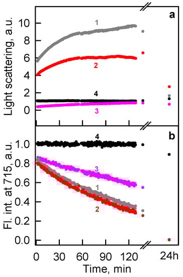 Analysis of kinetic dependences of the various spectral characteristics of iRFP713 confirmed the formation of aggregates at protein unfolding in the presence of GTC. The aggregation of the iRFP713 apo- and holoprotein was accompanied by drastic growth of the light scattering of the protein with the maximal 8-and 10-fold increase detected at the presence of 0.7 M (Figure 5a) and 1.05 M GTC (Figure 5c), respectively. The protein aggregation was also manifested by a significant increase in the parameter A to the value exceeding the level of the native protein (Figure 5b,d). The prolonged incubation of the iRFP713 apo- and holoprotein in a solution of the denaturant resulted in a monotonous decrease of the light scattering after the initial fast rise of the characteristic, which was obviously caused by the precipitation of protein aggregates. This allows us to assume that formed aggregates of iRFP713 have a large size.