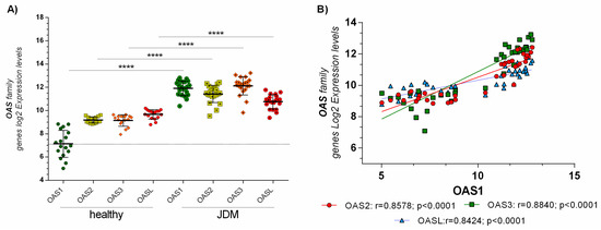 From a preliminary analysis, we showed that the OAS genes family were highly modulated (Supplementary Table S1). These genes play a crucial role during an infection mediated by a dsRNA virus. We found that OAS1 (p < 0.001), OAS2 (p < 0.001), OAS3 (p < 0.001), and OASL (p < 0.001) were highly expressed in JDM MBx compared to healthy controls (Figure 1A). Also, OAS genes family expression was positively correlated with each other in JDM MBx. No correlation was observed in healthy controls (Figure 1B).