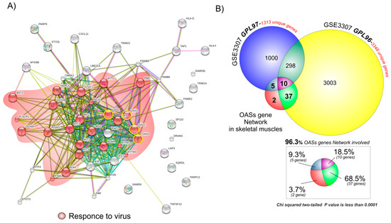 For the GIANT online tool, we set the tissue menu as skeletal muscles, the network filter with a minimum relationship confidence of 0.18, and the maximum number of genes as 50. The list of 54 genes (including the four OASs genes) obtained was loaded into the multiple sequences search set of the STRING software in order to obtain a graphical network representation (Figure 2A).