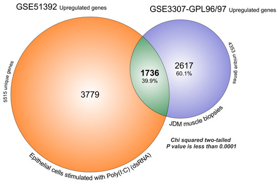 MBx of JDM transcriptome overlaps for 39.88% with significantly upregulated genes expressed in primary epithelial cells treated with polyinosinic-polycytidylic acid poly(I:C). The FDR analysis obtained by GEO2R, produced for GSE51392, 5515 significantly upregulated genes and for GSE3307, 4353 genes. The overlaps produced 1736 genes that were significantly upregulated in common (39.9%), and 2617 (60.1%) characteristics exclusive to JDM (chi-square two-tailed with a p value < 0.0001).