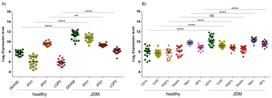 Extracellular dsRNA or intracellular dsRNA activate different signaling pathways: TLR3 and CD14 (endosome pathways), or DDX58 or IFIH1 (Cytoplasmic pathways), respectively [23]. The microarray dataset analysis showed a significant upregulation of DDX58 (p < 0.0001), IFIH1 (p < 0.0001) (Figure 4A), and also CD14 (p < 0.0001) and TLR3 (p < 0.0001) (Figure 4B), in MBx of JDM patients compared to healthy controls. When TLR3 recognizes dsRNA, it dimerizes, binds to CD14, and activates the signaling complex assembled by TRIF, TRAF3, TBK1, and IRF3. Moreover, we found that TRIF (p < 0.01) was significantly downregulated (Supplementary Table S1), whereas TRAF3 (p < 0.001), TBK1 (p < 0.001), and IRF3 (p < 0.001) were significantly upregulated in JDM vs. healthy controls (Figure 4B). As for the cytoplasmic RNA helicases DDX58 and IFH1, these proteins recognize dsRNA or 5′-triphosphorylated single-stranded (ss)RNA and use the mitochondrial membrane-bound protein IPS1 as the specific adaptor. We showed that DDX58 and IFH1 were significantly upregulated (Figure 4A) in JDM vs. healthy controls, while IPS1 was significantly downregulated (p < 0.001) (Figure 4A). Similar to TRIF, IPS1 activates the same transcription factors leading to the induction of similar genes. We found that IPS1 regulatory protein, LGP2, was significantly upregulated (p < 0.0001) in JDM vs. healthy controls (Figure 4A). This finding can partly explain the downregulation of IPS1. Overexpression of LGP2 was able to inhibit RIG-I-mediated antiviral signaling both in the presence and absence of viral ligands [24,25]. Furthermore, it was demonstrated that LGP2 can inhibit antiviral signaling independently of dsRNA or virus infection intermediates by engaging in a protein complex with IPS-1 [26].