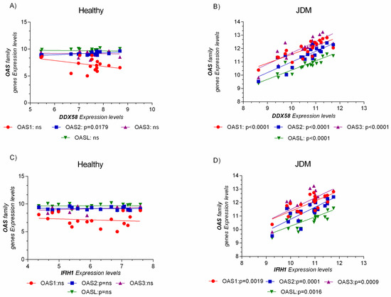 OAS gene expression levels were positively correlated to the pattern recognition receptor for virus’s infection. No correlation was observed in the healthy group (A,C). The expression level analysis of the OAS genes family and DDX58 (RIG-I, retinoic acid-inducible gene I), and IFIH1 (MDA5, melanoma differentiation-associated protein 5), reveals a positive correlation only in JDM MBxs (B,D). Data are expressed as log2 intensity expression levels and presented as dot plots. p values < 0.05 were considered to be statistically significant (* p < 0.05; ** p < 0.005; *** p < 0.0005; **** p < 0.00005).