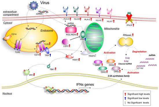 Inside the list of 1736 significantly upregulated genes that overlapped between GSE51392 and GSE3307, the OAS genes family was still present. Also, the dsRNA genes belonging to the transduction pathway, such as RIG-I (also known DDX58), IFIH1, IPS1 (also known MAVS), LGP2 (also known DHX58), CD14, TLR3, TBK1, and IRF, were part of those genes that were significantly modulated in common, in the two GSE (Figure 4) (Supplementary Figure S4 and Table S1). The expression levels of TRAF6 were an exception. A possible explanation for this event could be the downregulation of IPS-1 levels found in our analysis. In fact, it was largely demonstrated that RIG-like helicases signaling has been proposed to bifurcate at IPS-1 in two pathways, the TRAF3-dependent IRF activation pathway, and the TRAF6-dependent NF-κB activation pathway. The IPS-1 block could result in the downstream inhibition of TRAF6 [22]. With regard to TRAF3 upregulation, the signal divergence, and its regulation by TLR3 could explain its modulation.