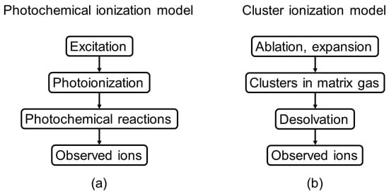 Matrix-assisted laser desorption/ionization (MALDI), an important and valuable ionization technique used in mass spectrometry [,], has been widely applied for the analysis of large biomolecules such as proteins and peptides []. MALDI has the advantages of producing high mass ions so that the mass spectra are more suitable for biomolecule analysis []. In recent years, MALDI has been successfully demonstrated to contribute to biomedical [], chemical [], and pharmaceutical [] research, which shows the impressive progress in diversified applications. Researchers found that understanding the MALDI mechanism is critically important when conducting qualitative and quantitative measurements, which is related to the reproducibility and mass resolution of experiments. To date, photochemical ionization [,,,,,,,,] and cluster ionization [,,,,,,] are the two major hypotheses to explain many of the experimental results in MALDI. The schematic diagrams of these two hypotheses are shown in Figure 1a,b. For the photochemical ionization model, the ions of the analyte are considered to be produced from a protonation/deprotonation process involving an analyte molecule colliding with a matrix ion in the gas phase. Energy pooling and multiphoton absorption are the major processes leading to the photoionization of a matrix molecule. All of the analyte ions have to come from collision processes between neutral analyte molecules and protonated or deprotonated matrix molecules. The cluster ionization model assumes that the protonated analyte ions are from hot matrix clusters that are produced during laser ablation. Analyte ions are produced in the gas phase by the desolvation of neutral matrix molecules. Nevertheless, it seems to be difficult to explain the predominant production of mono-charged ions for biomolecules with a broad mass range, as electrospray ionization (ESI) produces mostly multiply charged ions for large biomolecules. Even though numerous studies aimed to provide possible explanations for ion formation in MALDI [,,,,,,,,,,,,,,,,,,,,,,,,,,,,,,,], many experimental observations such as sweet spots and the matrix suppression effect still cannot be fully interpreted by these hypotheses.