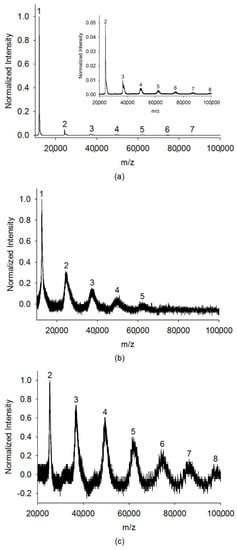 Figure 2a shows the mass spectrum of cytochrome c for a low cluster region obtained by the Bruker Ultraflex II MALDI-TOF/TOF mass spectrometer, and the insertion box shows a magnifying spectrum of the mass range from 20,000 to 100,000 Da. The clusters’ peaks from monomer to heptamer can be clearly seen in this region. The consistent observation results of cytochrome c for low cluster regions were also obtained by our instrument, as shown in Figure 2b,c. Frequency scanning was performed from 70 kHz to 10 kHz and from 50 kHz to 10 kHz with RF voltage at 800 Vpp, respectively. If the peaks are mainly from protein-matrix cluster, the smearing of the mass spectrum on the high mass side should be observed. In addition, only equal spaces between two neighboring peaks with the gap of m/z of 12,384 (molecular weight of cytochrome c monomer) were observed. This observation clearly indicates that these peaks mainly represent protein clusters, even though a small number of matrix adducts may also contribute to the ion signal.
