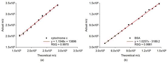 Mass calibration curves of expected m/z (theoretical value) versus measured m/z (actual value) for mass spectra of (a) cytochrome c with mass range from 150 kDa to 350 kDa, and (b) bovine serum albumin (BSA) with a mass range from 300 kDa to 1500 kDa.
