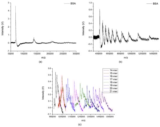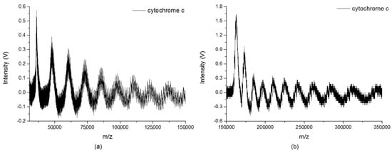 A broad mass range from 10 kDa to 1500 kDa has been demonstrated by our instrument. The mass spectra in the low-mass region were first measured to completely cover the small cluster distributions of cytochrome c and BSA, as shown in Figure 4a and Figure 5a, respectively. Figure 4b shows cytochrome c clusters from 150 kDa to 350 kDa after mass calibration. The helium pressure inside the ion trap was maintained at 50 mTorr in order to increase the trapping efficiency. The spectrum was obtained with the accumulation of ions for 100 laser shots, and the data were collected with a scan rate of 5 × 105 Hz/s. The asymmetric shapes of the clusters’ peaks observed in the figure are due to the electronic characteristic of our charge detector. For a single peak, the left side to the pulse height of the peak is the charge collection time and the other side is the discharge time, and the discharge time is much longer than the charge collection time. When detecting very heavy biomolecular ions, a small number of ions may reach the charge detector during the discharging period, as their flight time is longer than the charge collection time. This phenomenon may lead to the skewness at the back side of the peaks, and reduce the mass resolution in the high-mass region. Nevertheless, it is unlikely to affect the mass calibration, because the number of involved ions is small. The clusters’ peaks of cytochrome c, shown in the figure, can be clearly seen in the mass range up to 350 kDa. This observation confirmed the existence of large clusters of cytochrome c during the MALDI process.