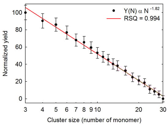 To quantitatively measure a broad distribution of biomolecular clusters by our instrument, the ions from MALDI were accumulated in the ion trap with 10 laser shots. The number of laser shots was fixed somewhat low here to avoid signal saturation by small cluster ions. The trapping frequency was swept to the step-scan various mass ranges. As stepwise scanning is not a continuous detection in the mass range, only the relative intensity distributions were recorded. The plot of the relative intensity distribution of cytochrome c from trimer to 30-mer is shown in Figure 6, with laser fluence around 9 mJ/mm2. The cluster size (x-axis) and the normalized relative intensity (y-axis) were plotted on a base-10 logarithmic scale. The relative intensity of each size of cluster shown in the figure is the average value of more than 50 data points, so as to achieve a more objective evaluation of the signal intensity. The distribution and variation trend of the experimental data can be readily observed. The higher the mass cluster of cytochrome c, the lower the relative intensity. A power–law dependence relationship with r2 being 0.994 fits very well for the quantitative description of the cluster size distribution. A τ value of 1.82 for the power–law exponent was obtained according to the Equation (1) after the curve fitting.