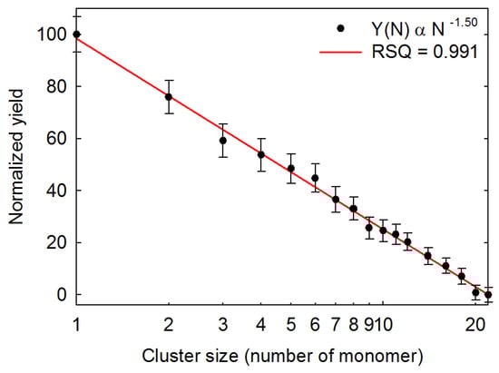Large cluster ions with a size distribution of BSA were also measured by our instrument. The laser fluence was around 9 mJ/mm2 and the ions were accumulated in the ion trap with 10 laser shots, in order to avoid signal saturation by the monomer ions. The relative intensity of each size of BSA cluster was the average value of more than 50 data points. As shown in Figure 7, the power-law dependence relationship with r2 at 0.991 fit very well for the cluster size distribution of BSA from monomer to 22-mer. A τ value of 1.50 for the power–law exponent was obtained according to Equation (2) by curve fitting. The cluster size distributions of the two biomolecules are about the same. The decay of the BSA clusters is slower than that of cytochrome c, which is consistent with the molecular dynamics simulations of MALDI in the high-mass region of the distributions []. The consistent experimental results for measuring cytochrome c and BSA indicate that large cluster ions of biomolecules from MALDI certainly agree to the power–law cluster size distribution.