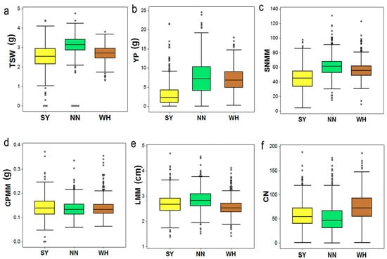 Boxplots displaying variation of six traits across three different environments (SY = Sanya, NN = Nanning and WH = Wuhan). Definition of the labels can be found at the end of this article.