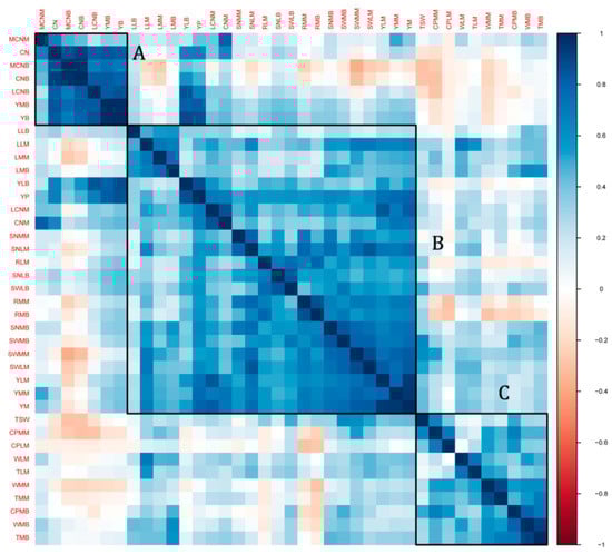 Correlation between all the seed yield-related traits in sesame. Blue color depicts positive correlation while red color means negative correlation. A, B and C correspond to the clusters of traits. Definition of the labels can be found at the end of this article.