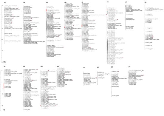 Genomic location of the 547 QTLs identified for seed yield-related traits in sesame. QTLs were named as follow: ENVIRONMENT-TRAIT-LINKAGEGROUP_POSITION. Bars represent the linkage groups of sesame genome. Red portions of the bars represent the previous QTLs detected by Wu et al. []. Red stars represent loci previously detected by Wei et al. []. Definition of the labels can be found at the end of this article.