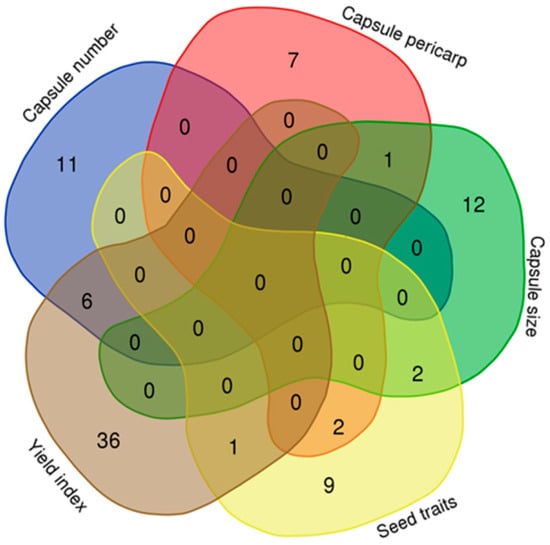Venn diagram depicting the shared and common QTLs between five groups of seed yield-related traits analyzed in this study.