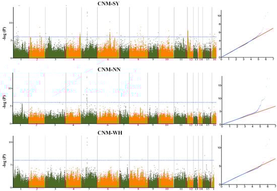 Genome-wide association mapping of effective capsule number in main stem (CNM) in sesame from three different environments (SY = Sanya, NN = Nanning and WH = Wuhan).