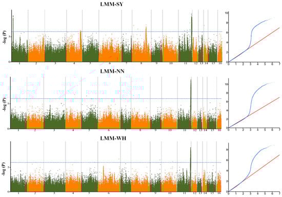 Genome-wide association mapping of length of medial capsule in main stem (LMM) in sesame from three different environments (SY = Sanya, NN = Nanning and WH = Wuhan).