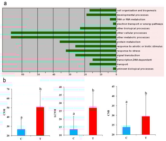 To identify the candidate genes controlling the seed yield-related traits in sesame, all the genes in 88 kb around the peak loci were retrieved []. In total, 7149 genes were identified and the number of genes in the LD window ranged between 8 and 42 (Table S4). Within these genes, 48 contained significant loci (Table S5). We particularly focused on these SNP-containing genes as they are more likely to modulate seed yield in sesame. Their homologs in Arabidopsis were identified and their functions predicted. Gene ontology analysis of these genes indicated that they are involved in developmental process, DNA and protein metabolism, response to stress, signal transduction, cell organization and biogenesis, transport and transcription (Figure 7a). Several homolog genes in Arabidopsis are well known to be directly or indirectly implicated in seed yield and biomass production. For example, the gene AGL20 (AGAMOUS-like 20) plays an important role in flowering time [], hence is directly associated with seed yield in Arabidopsis. In this study, we detected an intronic SNP located in the gene SIN_1013997 (homolog of AGL20) strongly associated with the branch per plant seed yield and with the medial capsules in branch seed yield. Another important illustration concerns the gene SIN_1006338 (SiACS8), which is located in the pleiotropic QTL associated with four various traits and was detected in all the three environments. A non-synonymous polymorphism (T/C) at the position 6,738,735 bp in this gene modulates the capsule number related traits (LCNM, CNM and CNB). An in-depth analysis suggests that the thymine allele is the favorable allele as it increases the capsule number on the stem and, therefore, leads to a higher yield (Figure 7b). Furthermore, the frequency of the T allele was rapidly increased by recent breeding, from 57% in landraces to 92% in modern cultivars. The gene SiACS8 was previously identified as being associated with the capsule number per axil, particularly controlling the 1:3 capsules per axil in sesame []. These results further support our findings, indicating that SiACS8 is indeed the causative gene controlling the capsule number trait in sesame. The homolog of SiACS8 in Arabidopsis AT4G37770 (AtACS8) was reported to be an auxin-induced gene involved in ethylene biosynthesis, suggesting that the number of capsules on sesame stem is under the regulation of plant hormones [].