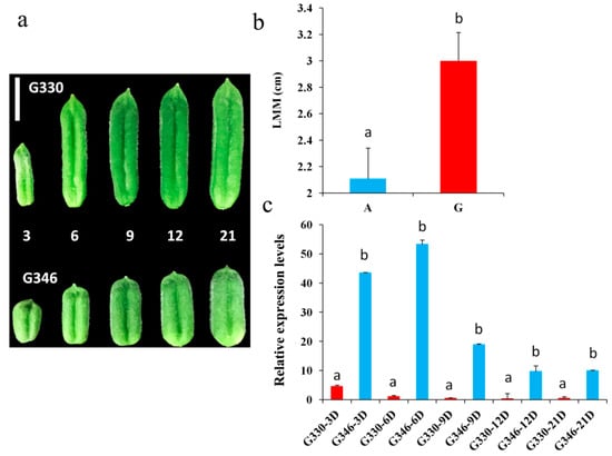 Expression analysis of the candidate gene for LMM trait between two contrasting accessions. (a) Phenotypes of G330 and G346 displaying long and short capsule length, respectively, at 3, 6, 9, 12 and 21 days after pollination. (b) Identification of the favorable allele at the locus 15,219,964 bp on the LG11. A total of 427 genotypes harboring the A allele and 175 harboring the G allele were used. (c) qRT-PCR relative expression level of the gene SIN_1010995 between G330 and G346 at different days after pollination. Different letters above bars represent significant difference (p < 0.05) between genotypes. The error bar indicates the standard error of the mean. The sesame Actin gene (SIN_1006268) was used as the internal reference and 3 biological replicates and 3 technical replicates were used.