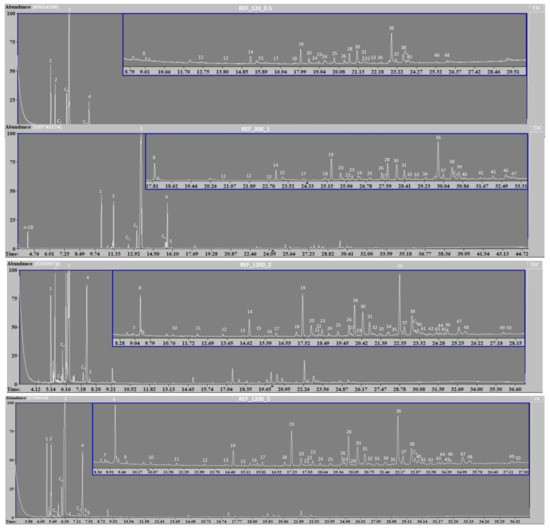 GC-MS analysis was performed on a Thermo Trace 1300 gas chromatograph, using a Thermo Scientific ISQ mass spectrometer with electron ionization source (70 eV). The system was equipped with a 30 m long Restek MXT-5 column with a diameter of 0.25 mm coated with a stationary phase, consisting of 5% diphenyl and 95% dimethylpolysiloxane and a thickness of 0.25 µm. A split injection was used with a 1/3 split ratio, an injection volume of 1 μL, an inlet temperature of 320 °C and a helium carrier gas flow of 0.9 mL/min. The column temperature was programmed as follows: 2 min at 40 °C, increase to 120 °C at 20 °C/min, increase to 200 °C at 10 °C/min, increase to 250 °C at 7 °C/min, increase to 350 °C at 5 °C/min, 4 min hold at 350 °C. The transfer line and the ion source were kept at 300 °C, the solvent delay time was set at 3 min 40 s, the examined mass range of the scans was 33–720 amu and the scan time was 0.304 s. A reference linear C7 to C40 linear alkane ladder standard (49452-U, Supelco (Bellefonte, PA, USA) at three different concentrations (0.001, 0.01 and 0.1 µg/mL) was run to determine retention times and retention indices, and for determining response factors.