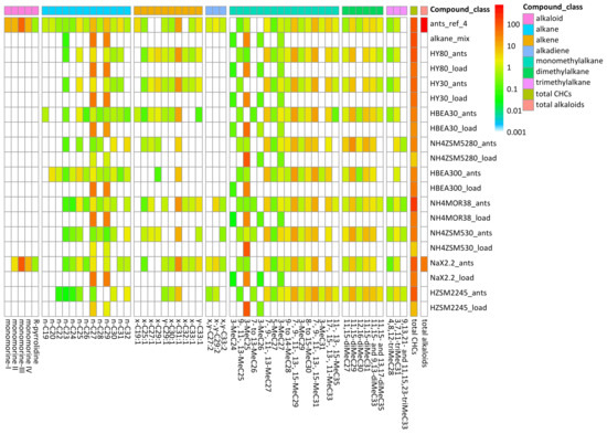 Heat map of the GC-MS data, showing the extracted cuticular profile composition (percent CHC (cuticular hydrocarbons, without alkaloids) and percent alkaloid) of M. pharaonis foragers and the adsorption of the different epicuticular compounds by nine zeolite materials upon exposure to foragers for 1 h (represented as _ant). The composition of the alkane mixture (alkane_mix) and the compounds retrieved from the zeolites after loading them with the solution (represented as _load) are also provided. Materials are sorted by induced mortality, from high at the top to low at the bottom [21]. When two compounds were present in the same peak, the most abundant compound was chosen for representation. R-pyrrolidine is trans-2-(1-hex-5-enyl)-5-(non-8-enyl)-pyrrolidine and total CHC is total cuticular hydrocarbons. Total CHC and total alkaloid are represented in µg/500 µL.