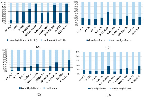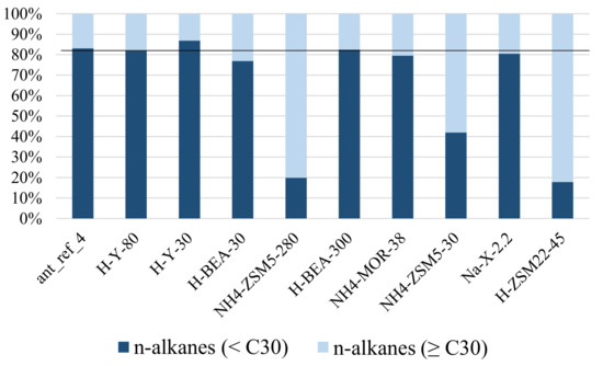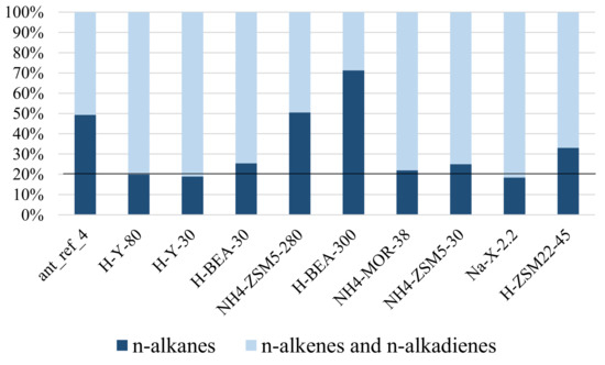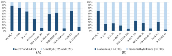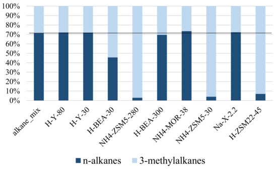 These results showed that the analysis of the adsorbed compounds is not trivial. The quantity of hydrocarbons recovered in the n-hexane extracts was systematically lower than the quantity loaded onto the zeolites, indicating that part of the adsorbed hydrocarbons could not be extracted again using n-hexane. The distribution of n-alkanes and monomethylalkanes in the extracts (Figure 3 and Table 3) showed that zeolites H-Y-30, H-Y-80, H-BEA-300, NH4-MOR-38 and Na-X-2.2 are non-selective while other zeolite materials—H-BEA-30, NH4-ZSM5-30, NH4-ZSM5-280 and H-ZSM22-45—strongly adsorb n-alkanes rather than methylated compounds and thus the extract is enriched with more weakly adsorbed methylated compounds. This effect is less severe in the H-BEA-30 sample, where the percentage of n-alkanes in the extract is still 45.5% compared to 71.1% in total (extractable and non-extractable compounds). In NH4-ZSM5-30, NH4-ZSM5-280 and H-ZSM22-45, the zeolites with the narrowest pores of the investigated zeolite collection, the amount of n-alkanes in the extract did not even reach 0.5%, indicating these compounds are particularly strongly adsorbed.