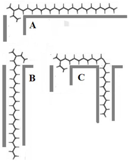 Possible key-lock adsorption configurations of 3-methylpentacosane. (A) The configuration with the shortest end of the backbone, before the methyl branch, adsorbed in the pore. The longest end of the backbone is adsorbed on the surface of the material; (B) the configuration where the longest end of the backbone is adsorbed in the pore and the shortest end of the backbone is adsorbed on the surface of the material; (C) the configuration where the shortest end of the backbone is adsorbed inside a pore and the longest end of the backbone reaches the next pore opening, allowing it to be partially adsorbed inside this pore.