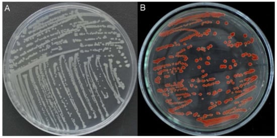 Growth of strain Se03 on YEP (Yeast Extract Peptone) agar plates in absence (A) and presence (B) of 5.0 mM selenite. The red colony color indicates selenite reduction and the formation of elemental selenium (Se0).