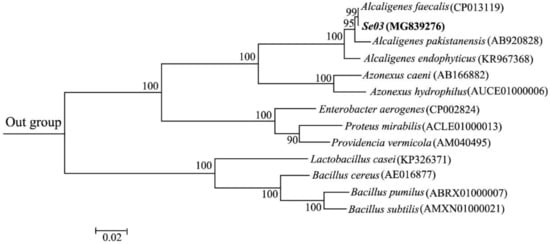 Based on 16S rRNA gene sequence and phylogenetic evolution analysis, isolate Se03 showed a high degree of similarity (99%) with Alcaligenes faecalis (Figure 2). Given that it also exhibited the typical biochemical and physiological characteristics of A. faecalis (Table 1), the strain Se03 was identified as A. faecalis Se03. A. faecalis is a Gram-negative, rod-shaped bacterium that is commonly found in soil, water, and environments associated with animals. In addition, it has been recently demonstrated that A. faecalis can degrade a wide range of aromatic compounds including polyaromatic hydrocarbon [], naphthalene, and phenanthrene [], and can detoxify heavy metals [,]. However, this is the first study to demonstrate that an A. faecalis strain can reduce selenite to Se0 and biosynthesize SeNPs.
