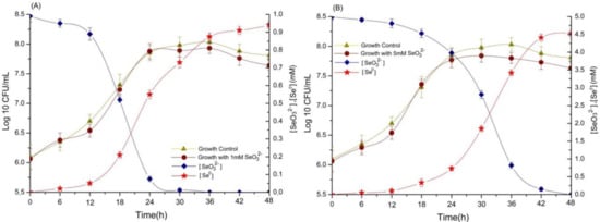 Time courses of bacterial growth, SeO32− reduction, and Se0 formation by the strain A. faecalis Se03 grown in YEP medium supplied with (A) 1 mM Na2SeO3, and (B) 5.0 mM Na2SeO3. Each test was performed in triplicate and error bars represent the standard deviation.