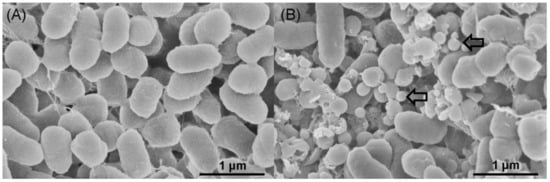 Transmission electron microscopy (TEM) and scanning electron microscopy (SEM) were used to determine the location of SeNPs produced by A. faecalis Se03. TEM analysis found that most of the electron-dense nanoparticles were located in the extracellular spaces and only a few were observed in the cytoplasm (Figure 4B,C), while these particles were not detected in cell cultures in the absence of SeO32− (Figure 4A). The particles were spherical and of various sizes (i.e., diameters ranging from approximately 100 to 400 nm), similar to those found in in Duganella sp. [], Agrobacterium sp. [], E. cloaocae [], B. selenitireducens []. SEM micrographs also showed the extracellular location of the electron-dense nanoparticles, their spherical shape, and various sizes (Figure 5, indicated by white arrows). Interestingly, empty ghost cells were observed using TEM (indicated by the red arrows in Figure 4B). Empty ghost cells were also found in a study of Candida utilis ATCC 9950. These ghost cells were observed in aging yeast as a result of cell membrane breakage and cytoplasm leakage when C utilis ATCC 9950 was cultured in media supplemented with sodium selenite []. Lampis et al. [] also found that empty cells were abundant during the stationary growth phase of S. maltophilia SeITE02 in the presence of 0.5 mM selenite, possibly due to the release of Se0 particles into the medium. However, there is a lack of experimental evidence to determine whether vesicular secretion or cell lysis is involved in the release of intracellularly formed Se0 nanoparticles by A. faecalis Se03. More research is thus needed to further elucidate the release mechanisms of Se0 nanoparticles.