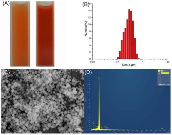 DLS spectra of purified SeNPs produced by A. faecalis Se03 in YEP supplemented with 5.0 mM selenite. (A) Selenite-dosing cells (left) and purified nano-selenium (right); (B) size distribution of purified SeNPs; (C) SEM micrographs of purified SeNPs. (D) EDX analysis of purified SeNPs showing its selenium composition.