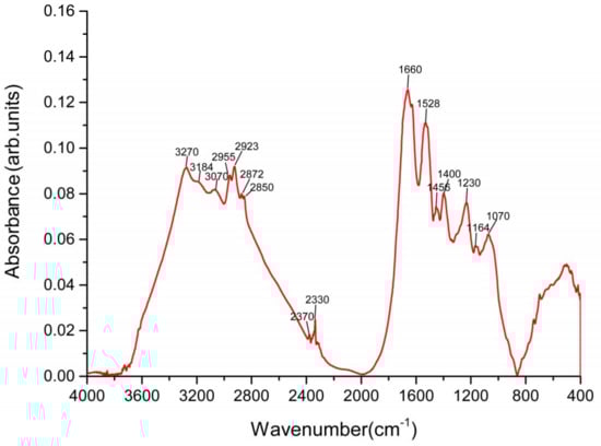 The Fourier transform infrared (FTIR) spectrum of the SeNPs is presented in Figure 7. The bands observed at 3270 cm−1, 3184 cm−1, and at 3070 cm−1 may be assigned to different N–H stretching vibrations and amide A of proteins, respectively. A number of typical C–H stretching bands can also be observed at 2955, 2923, 2872, and 2850 cm−1 (aliphatic groups). The band at 1660 cm−1 with the accompanying less-intensive bands at 1528 and 1230 cm−1 represent the amide I, amide II, and amide III modes, respectively, typical of proteins. The weaker band at 1456 cm−1 corresponds to the CH2 scissoring mode. Note that the band at 1400 cm−1 may be assigned to the symmetric stretching vibrations of carboxylate (COO−), while its asymmetric counterpart may be seen as a peak around 1620 cm−1 (largely overlapped by the amide I band). The bands at 1164 and 1070 cm−1 are typical of C–O–C and C–O vibrations in carbohydrates, which may represent the presence of polysaccharides in the capping layer of the SeNPs. Thus, the FTIR analysis clearly demonstrated that organic residues such as carbohydrates and proteins were present on the surface of the SeNPs produced by A. faecalis Se03. Previous studies on Thauera selenatis [] and S. maltophilia SeITE02 [] have identified the functional groups of the bacterial biomolecules involved in the selenite reduction and the stabilization (capping) process for synthesized SeNPs. Therefore, our findings not only indicate bacterial protein-mediated selenite reduction but also corroborate the synthesis and stabilization of SeNPs by the proteins present in the bacteria [].