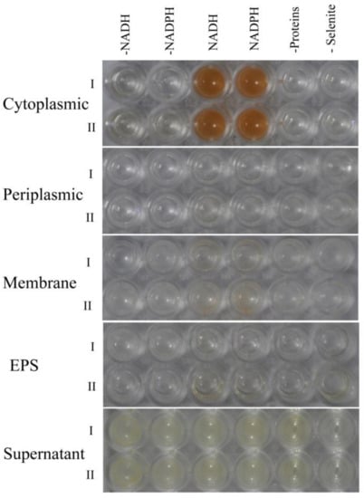 Selenite reduction assay on different subcellular fractions (cytoplasmic, periplasmic, and membrane), supernatant, and exopolysaccharide. All experiments were performed in duplicate (indicated by roman numbers), with addition of 5.0 mM SeO32− and 2.0 mM NADH or NADPH. While 3 following control negatives were performed: without protein fractions or supernatant or EPS, without selenite, without NADH or NADPH.