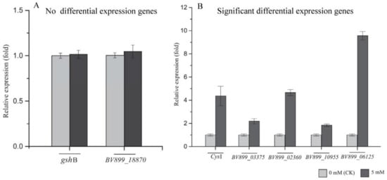 Previous studies have found that selenite can react with glutathione (GSH) to form Se0 and reduced GSH through Painter-type reactions [] and that other enzymatic systems, such as sulfite reductase, flavoprotein, and thioredoxin, are also involved in the reduction of selenite and Se0 formation [,]. Therefore, the mRNA expression of genes suspected to be involved in selenite reduction and SeNP formation in A. faecalis Se03, including glutathione synthetase (gshB), sulfite reductase (CysI), the sulfate transporter subunit (BV899_03375), flavoprotein sulfite reductase (BV899_18870), thioredoxin reductase (BV899_02360), peroxiredoxin (BV899_10955), and superoxide dismutase (BV899_06125), was assessed using real-time PCR (Table 2). The Shapiro-Wilk test showed a normal distribution of expression fold changes for all selected genes (Supplementary Table S1). As shown in Figure 9, the mRNA expression of gshB and BV899_18870 in cells cultured with selenite was not different from cells without selenite treatment, suggesting that GSH might not be involved in the reduction of selenite to SeNPs. However, selenite treatment significantly promoted the mRNA expression of CysI, BV899_03375, BV899_02360, BV899_10955, and BV899_06125 (a 4.4-, 2.2-, 4.7, 1.8-, and 9.6-fold increase, respectively).