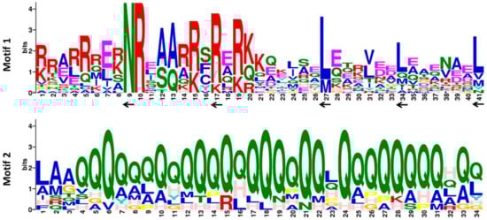 To obtain insight into the divergence and function of CrebZIP TFs, the conserved motifs in the CrebZIPs were analyzed by MEME software. As depicted in Figure 2, all CrebZIP proteins contained the typical bZIP structure domain (motif 1). In addition, a glutamine (Q) enrichment region (motif 2) was detected in 10 CrebZIP proteins including CrebZIP1, 3, 6, 8, 10, 11, 12, 14, 15, and 16. In general, the basic region of bZIP protein has an invariant N-x7-R/K-x9 conserved motif residue rich in lysine (K) and arginine (R). The leucine zipper linked to the C-terminus of the basic region contains two sequential heptad repeat peptides, where a leucine (L) is located at the seventh of each peptide. In some cases, the leucine residue is replaced by isoleucine, valine, phenylalanine, or methionine. For CrebZIP proteins, the primary structure of the conserved domain was detected as N-x7-R/K-x9-L-x6-L-x6-L (motif 1), which is consistent with Arabidopsis bZIPs [17].
