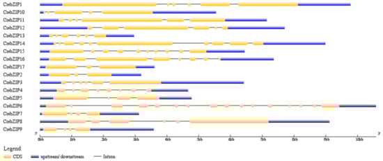 The Exon-intron organization of CrebZIP genes. The exons and introns are represented by yellow boxes and horizontal black lines, respectively. Untranslated regions are shown with blue boxes. The length of CrebZIP genes are indicated by the horizontal axis (kb).
