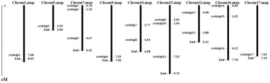 Chromosome assignment of CrebZIP genes depicted by MapInspect software displayed 17 CrebZIP genes unevenly distributed on nine chromosomes of C. reinhardtii. Three CrebZIP genes were located on chromosomes 7, 12, and 16. Chromosomes 10 and 13 both had two CrebZIP genes. Only one CrebZIP gene was found on chromosomes 1, 5, 9, and 17 (Figure 4). In addition, several CrebZIP genes including CrebZIP1, 2, 6, 13, and 17, were distributed near the ends of chromosomes.