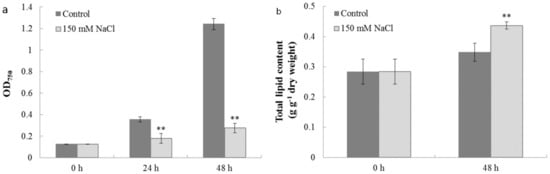 The effects of salt stress on C. reinhardtii growth and lipid accumulation are shown in Figure 5. Salt stress (150 mM NaCl treatment) significantly affected the cell growth, with OD values increasing slowly from 0.127 ± 0.002 to 0.276 ± 0.044 during 48 h cultivation, while the cell growth curve showed a rapid increase in the control with OD values from 0.127 ± 0.002 to 1.242 ± 0.052 (Figure 5a). In contrast, total lipid content in C. reinhardtii cells under salt stress significantly increased from 0.284 ± 0.029 to 0.437 ± 0.012 (Figure 5b), whereas lipid content in the control only increased at a small scale from 0.284 ± 0.029 to 0.348 ± 0.022, after 48 h cultivation. Consistent with these findings, Kato et al. observed that salinity stimulated lipid accumulation, but negatively affected biomass production in microalgae [44].