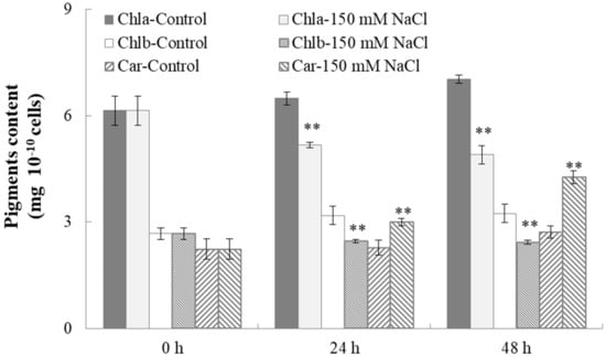 To investigate the effects of salt stress on C. reinhardtii photosynthesis, the contents of three pigments, Chlorophyll a (Chla), Chlorophyll b (Chlb), and carotenoids (Car), were measured. As shown in Figure 7, salt stress also led to significant changes in pigment content of C. reinhardtii. Under salt stress, Chla and Chlb contents in C. reinhardtii both decreased from 6.147 ± 0.409 and 2.680 ± 0.161 to 4.903 ± 0.258 and 2.427 ± 0.0.055 mg 10−10 cells, respectively, during 48 h cultivation, showing significant difference from the control where Chla and Chlb contents increased during cultivation. Chlorophyll is the main light-harvesting molecule for photosynthetic organisms. The reduction of chlorophyll content indicated weakened photosynthesis in C. reinhardtii under salt stress, possibly being the result of decreased synthesis or enhanced degradation of chlorophylls caused by the stress. It is known that salinity caused limitations in photosynthetic electron transport and then photosynthetic rate [48]. Moreover, salinity may stimulate chlorophyllase activity and accelerate chlorophyll degradation [49]. Unlike the chlorophyll case, the carotenoid content in C. reinhardtii grown under salinity increased from 2.240 ± 0.295 to 4.263 ± 0.180 mg 10−10 cells after 48 h cultivation, in comparison with the control where carotenoid content exhibited no obvious change during the cultivation. Higher carotenoid content under salt stress in C. reinhardtii was possibly due to positive adaptation to the stress, which was also observed in microalgae Botryococcus braunii by Rao et al. [50]. It was proved that carotenoids could protect the photosynthetic apparatus from photo-oxidative damage [51], providing the protection mechanism for microalgae cells against adverse stresses.