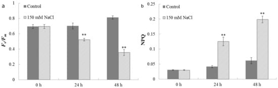 The effects of salt stress on (a) the maximum photo-chemical efficiency (Fv/Fm) and (b) non-photochemical quenching co-efficiency (NPQ) of C. reinhardtii. Cell samples harvested after 0, 24, and 48 h cultivation from both the salt treatment and the control, were used for measurements of Fv/Fm and NPQ. Each value is the mean ± SD of three biological replicates. Asterisks indicate statistical significance (* 0.01 < p < 0.05, ** p < 0.01) between control and salt-treated cells according to the Tukey’s test.