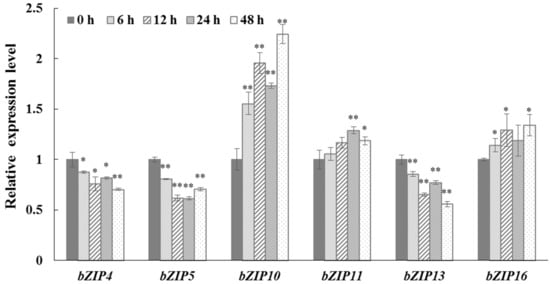 Expression profiles of six CrebZIP genes in C. reinhardtii under salt stress. Expression of CrebZIP genes was determined by qRT-PCR using total RNA from microalgae cells sampled at different time points of salt treatment. The α-tubulin gene was used as the internal reference gene. Each value is the mean ± SD of six biological replicates. Asterisks indicate statistical significance (* 0.01 < p < 0.05, ** p < 0.01) between control and salt-treated cells according to the Tukey’s test.