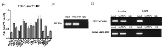 Next, we investigated how the large lncRNA NTT regulates nearby genes (potentially downstream genes). NTT expression in THP-1 was knocked down by si-RNA and the relative mRNA levels of nearby genes were analyzed (Figure 2A). Transfection of si-NTT in THP-1 led to decreased expression in almost all downstream genes, except L3MBTL3, MYB, and AHI1. NTT knockdown showed the greatest impact on PBOV1 expression (Figure 2A). Since it has been reported that lncRNAs may bind to hnRNP proteins to regulate downstream genes, we further studied if NTT could bind to the PBOV1 promoter via interaction with the hnRNP-U protein. An RNA immunoprecipitation assay showed that NTT could bind to hnRNP-U (Figure 2B). DNA ChIP showed that hnRNP-U binds to two positions of the PBOV1 promoter, and the hnRNP-U binding became undetectable after NTT knockdown (Figure 2C), suggesting NTT might enhance PBOV1 expression by interacting with hnRNP-U binding to the promoter of PBOV1.