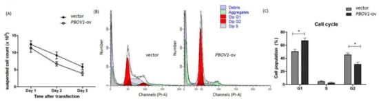 Overexpression of PBOV1 in THP-1 cells results in cell cycle arrest. (A) Count of suspended THP-1 cells after transfection of PBOV1-overexpression vectors; n = 6, bars represent mean ± SEM. (B) Cell cycle analysis of THP-1 cells transfected with control vector (left) or with PBOV1-overexpression vector (right) for 48 hours; here are representative graphs of four independent experiments, showing G1 arrest in PBOV1-overexpressing THP-1. (C) Percentage of THP-1 cells in Gap 0/Gap 1 (G0/G1), Synthesis (S), and Gap 2/Mitosis (G2/M) phase; n = 4, bars represent mean ± SEM. * p < 0.05 by Mann Whitney U test.