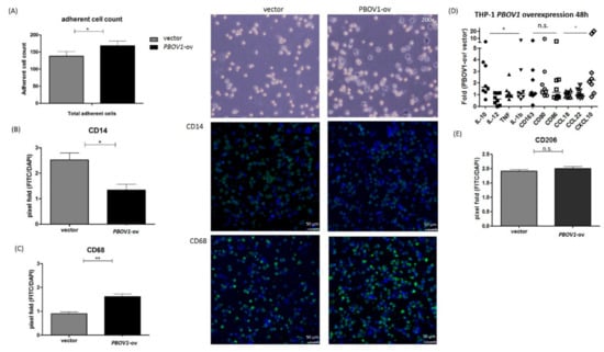 Overexpression of PBOV1 in THP-1 cells promotes differentiation into macrophages. (A) Adherent cell counts increased after transfection of PBOV1 overexpression vector for 48 h. Left: Bars represent mean ± SEM, n = 6; Right: images under light microscope after removing suspended cells; * p < 0.05 by Mann–Whiney U test. (B) Decreased CD14 expression in PBOV1-overexpressing THP-1 cells. Left: Columns are CD14-FITC-positive cells counted by Image J tool, bars represent mean ± SEM, n = 5; Right: confocal microscopy images of immunohistochemical staining of CD14 (green) and cell nucleus (blue). * p < 0.05 by Mann Whitney U test (C) Increased CD68 expression in PBOV1-overexpressing THP-1 cells. Left: Columns are CD68-FITC-positive cells counted by Image J tool, bars represent mean ± SEM, n = 5; Right: confocal microscopy images of immunohistochemical staining of CD68 (green) and cell nucleus (blue). ** p < 0.01 by Mann Whitney U test (D) M1/M2 profiling of THP-1 cells transfected with PBOV1-overexpression vector for 48 h. Lines represent medians, n = 8; showing marked elevation in IL-10 and CXCL10 RNA expressions; * p < 0.05 by Kruskal–Wallis test; n.s.: not significant by Kruskal–Wallis test (E) PBOV1-overexpressed THP-1 cells secrete more CXCL10 in the supernatant than control. Bars represent mean ± SEM, n = 6; * p < 0.05 by Mann–Whiney U test. (F) THP-1 cells transfected with control vector or PBOV1-overexpression vector were further differentiated into macrophage (via phorbol 12-myristate 13-acetate (PMA)) and polarized to M2 (via IL-4 and IL-13). Immunohistochemical staining of CD206 shows no difference of expression between THP-1 transfected with control vector or with PBOV1-overexpression vector; n = 5, bars represent mean ± SEM. n.s.: not significant by Mann Whitney U test.