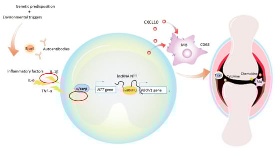 Prostate and breast cancer overexpressed 1 (PBOV1) was first described to be upregulated in certain cancers involving tumor proliferation and is variably associated with patient survival [24,25,27]. In prostate cancer cell lines, PBOV1 overexpression was found to promote tumor proliferation and cell cycle progression [25]. However, the role of PBOV1 in autoimmune diseases is still unknown. We are the first to investigate the function of PBOV1 in monocytes. As observed in untreated RA PBMCs, high levels of PBOV1 might be downstream of C/EBPβ/NTT hyperactivations. Although C/EBPβ is known to drive macrophages towards an anti-inflammatory phenotype [33,34], we found that macrophages differentiated from PBOV1-overexpressed THP-1 cells upregulated the RNA expressions of IL-10 (mostly between 1- and 2-fold) and the pro-inflammatory chemokine CXCL10 (mostly more than 2-fold). We could not detect IL-10 protein in the supernatant at 48 or 64 h after transfection, suggesting the detection of IL-10 RNA upregulation might be nonspecific and transient. As for CXCL10, markedly elevated protein levels were also detected in PBOV1-overexpressed THP-1 supernatants. The pro-inflammatory chemokine CXCL10 has been reported to attract activated macrophages, T cells, and NK cells to the site of inflammation and is upregulated in autoimmune diseases, including RA [38,39,40,41,42]. It is suggested that CXCL10 increases the migration of inflammatory cells via CXCR3-mediated ERK activation and stimulates the production of osteoclastogenic cytokines in CD4+ T cells, resulting in bone destruction in RA [43]. We therefore speculate that NTT-induced monocyte/macrophage PBOV1 expression in genetically predisposed individuals plays a pathogenic role in RA via enhancing the secretion of the chemokine CXCL10, which could lead to synovial inflammation and joint destruction (Figure 7). Studies on the expressions of NTT and PBOV1 in blood monocytes and synovial macrophages of different disease phases might help to clarify their pathogenic roles in RA. Since NTT is also expressed in T cells, the function of NTT in regulating macrophage—T cell interactions in RA development warrant further research.