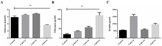 2.1. Time-Course of Plasma Glucose, Insulin, and Glucagon after Acute Cold Stress