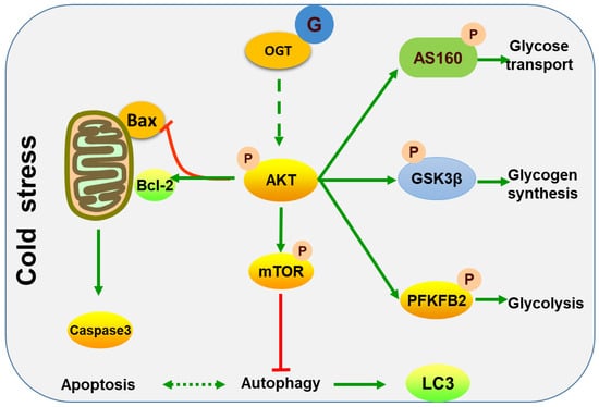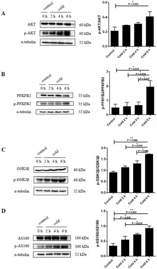 2.5. Cold Stress Induces Protein Kinase B (AKT) Activation and Promotes Glucose Metabolism