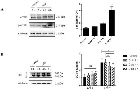 2.7. Cold Stress Promotes Autophagy by Activating the AKT/mTOR Pathway